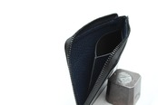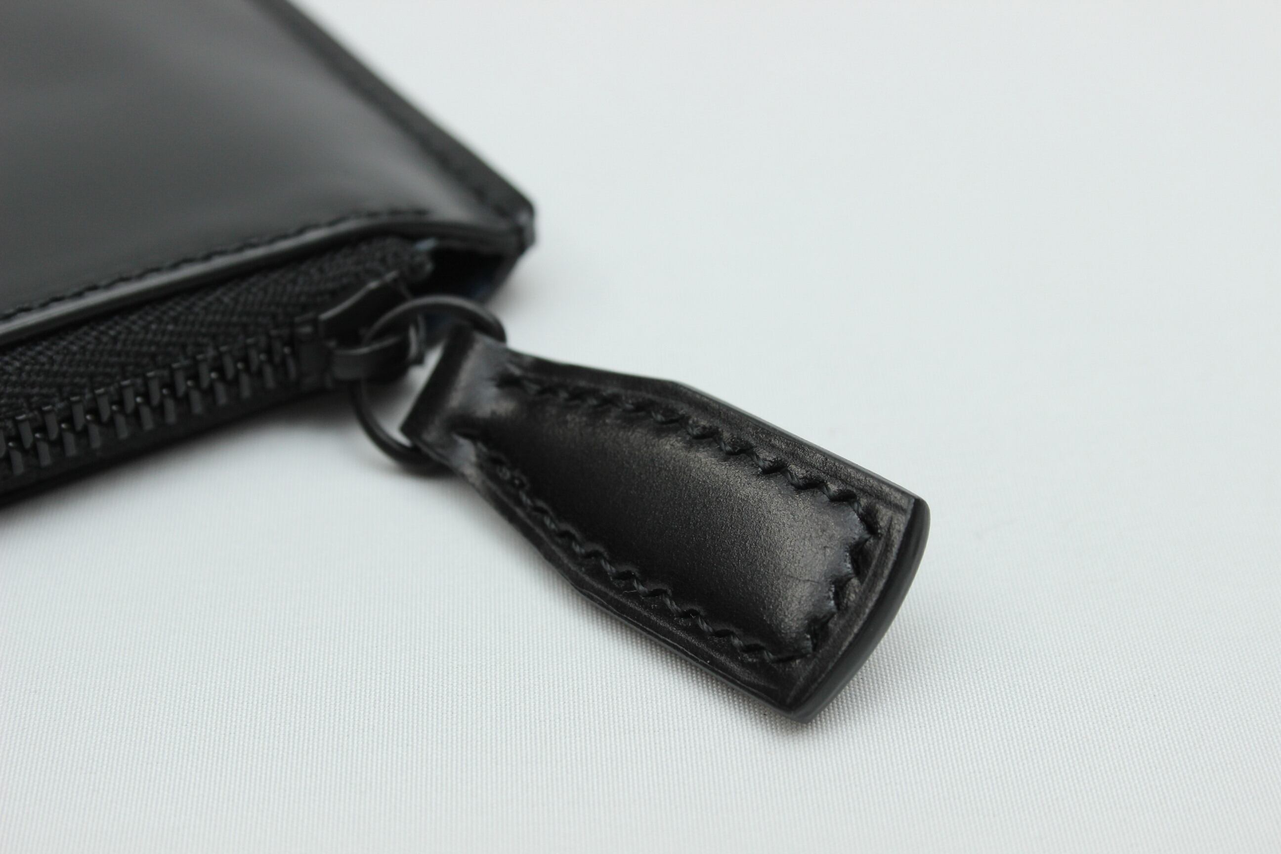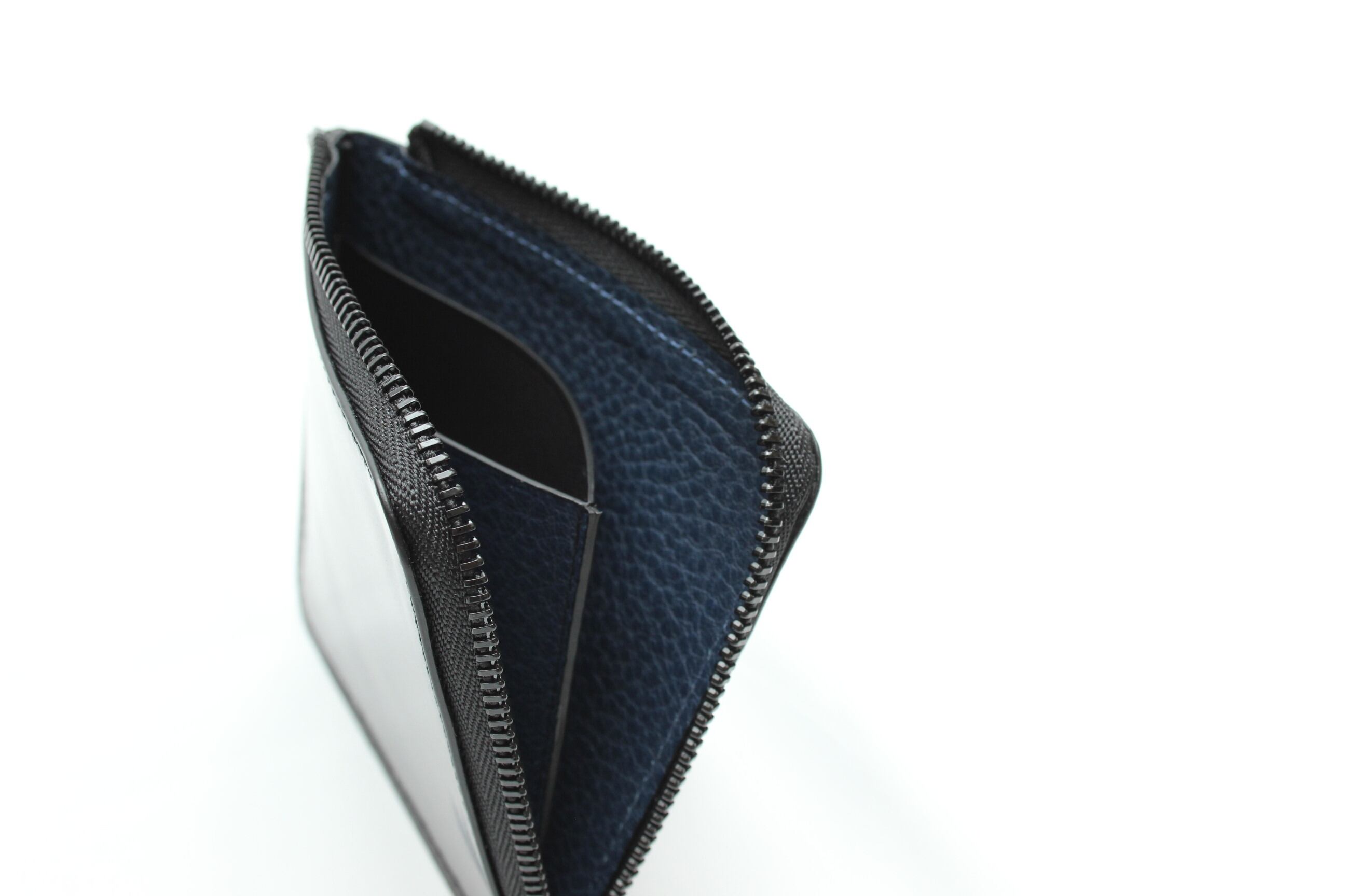 外装は新喜皮革のオイルコードバンの黒、内装は傷がつきにくい国産のネイビーのシュリンクレザーを使用。内装も付いておりますので、高級感と耐久性があります。