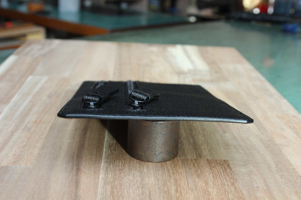 革の表面の凹凸部分の、凸の部分に漆塗りを施した、