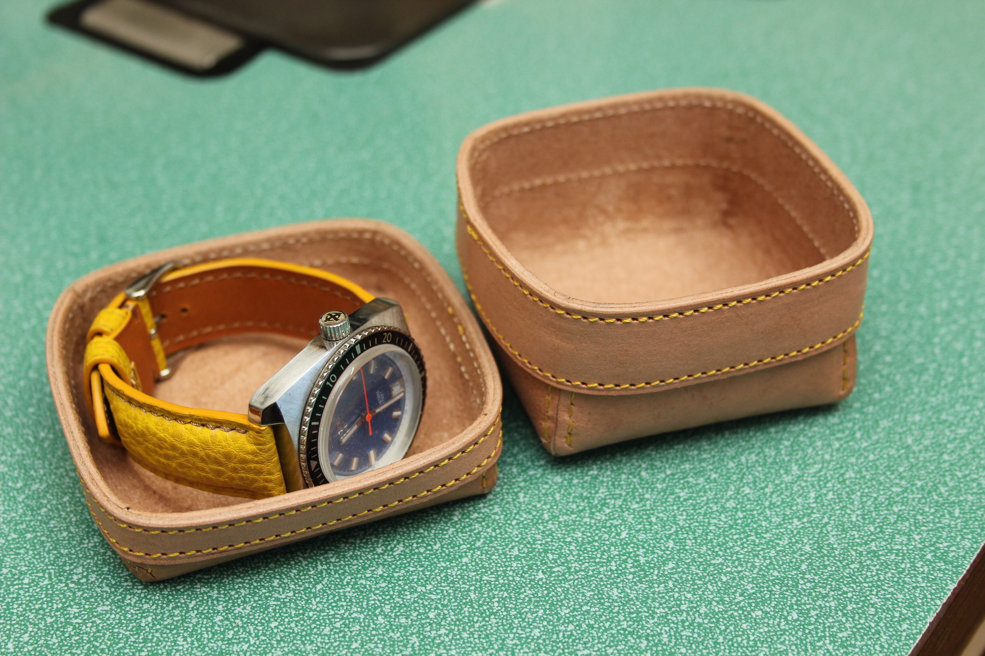 「10年前に試作した革小箱を、ピットヌメの素材感を活かして再び製作。クリップや腕時計、小物を収めるのにちょうどいいサイズ感。」